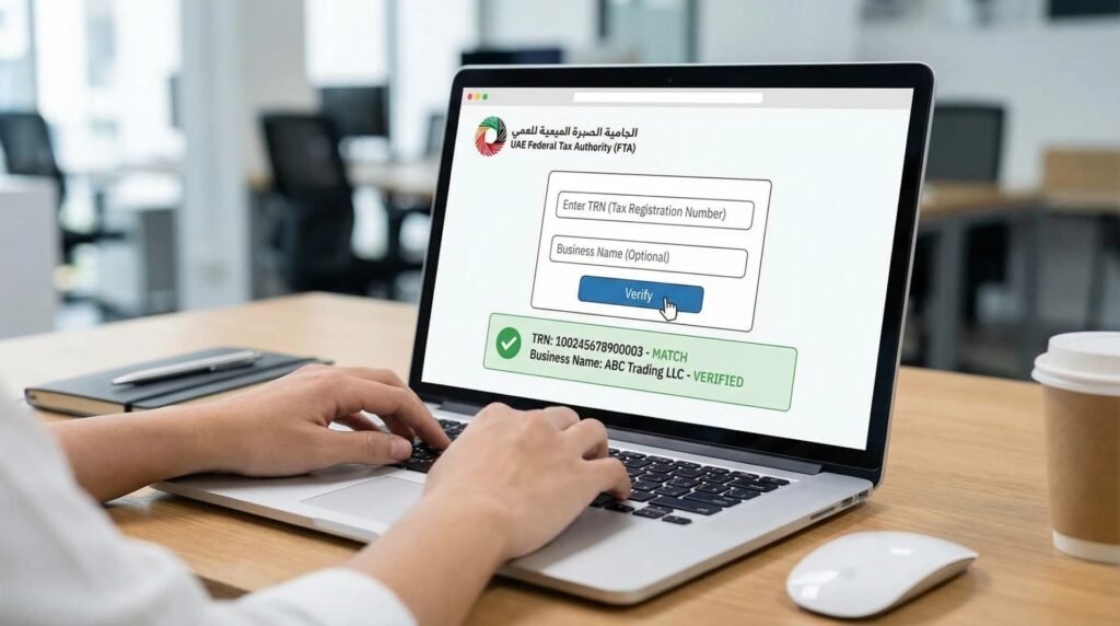 The safest approach is to use the official FTA TRN verification tool (a public check designed for confirming VAT registration details).