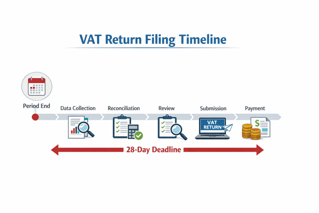 | VAT return deadline | Typically within 28 days after the tax period ends | Late submission can trigger penalties and cash flow issues |